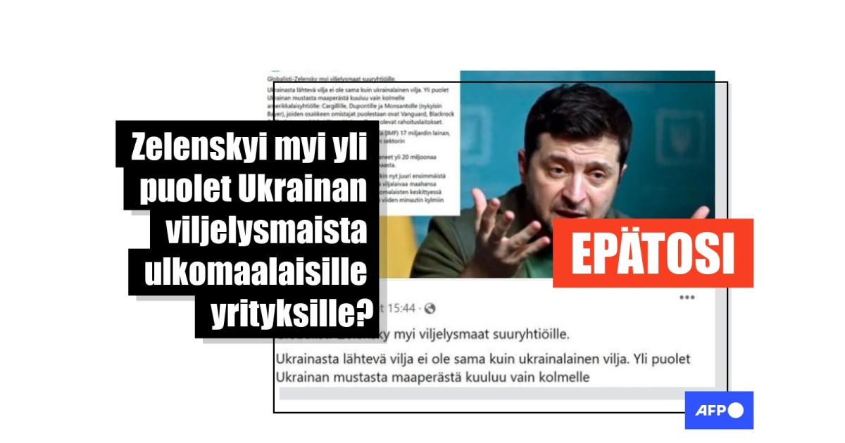 Elokuun 2022 alun jälkeen sadat sosiaalisen median käyttäjät ovat jakaneet suomenkielisiä päivityksiä Facebookissa väittäen, että Ukrainan presidentti Volodymyr Zelenskyi myi ukrainalaista maatalousmaata suuryhtiöille ja että yli puolet maatalousmaasta kuuluu nyt kolmelle yhdysvaltalaiselle yritykselle. Tuhannet näkivät väitteen Telegramissa, ja se on kiertänyt myös Twitterissä ja Rapsodia-verkkosivulla, jonka esittämiä väitteitä AFP on osoittanut vääriksi useita kertoja aiemmin (esimerkiksi täällä,täällä ja täällä). Samanlaisia väitteitä on esitetty myös saksaksi, englanniksi, ranskaksi, puolaksi, unkariksi, slovakiksi jatšekiksi.