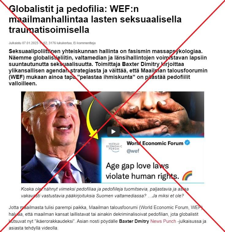 "Maailman talousfoorumi vaatii nyt, että seksi lasten kanssa dekriminalisoidaan, ja väittää, että lait 'ikäerorakkautta', joka tunnetaan paremmin pedofiliana, vastaan 'rikkovat ihmisoikeuksia'", sanotaan englanninkielisellä videolla, joka oli osa Uudessa MV-Lehdessä 7.1.2023 julkaistua artikkelia. Sosiaalisen median seuraamiseen tarkoitetun CrowdTanglen mukaan artikkelia jaettiin Facebookissa, ja siitä kertovia päivityksiä katsottiin laajasti suomenkielisillä Telegram-kanavilla. AFP on osoittanut vääriksi useita Uudessa MV-Lehdessä esitettyjä väitteitä aiemmin, esimerkiksi täällä, täällä ja täällä.