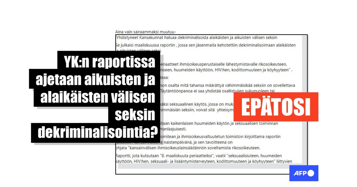 "Aina vaan sairaammaksi muutuu- Yhdistyneet Kansakunnat haluaa dekriminalisoida alaikäisten ja aikuisten välisen seksin", alkaa suomenkielinen, huhtikuussa julkaistu Facebook-päivitys. Siinä viitataan raporttiin, jota sanotaan YK:n laatimaksi ja jonka väitetään ajavan lasten seksuaalisen hyväksikäytön sallimista.