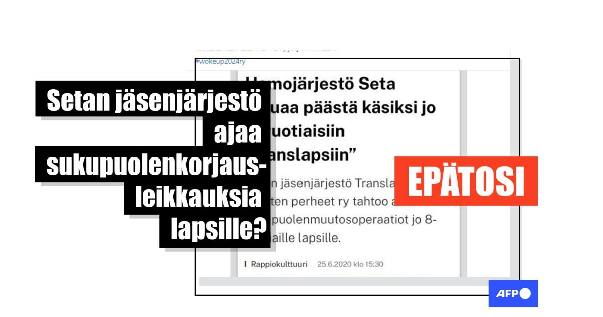 "Homojärjestö Seta haluaa päästä käsiksi jo 8-vuotiaisiin 'translapsiin'", sanotaan artikkelin otsikossa, joka näkyy kesäkuun 2023 alussa julkaistussa ja yli sata kertaa jaetussa Facebook-päivityksessä. Ingressissä sanotaan: "Setan jäsenjärjestö Translasten ja -nuorten perheet ry tahtoo aloittaa sukupuolenmuutosoperaatiot jo 8-vuotiaille lapsille".