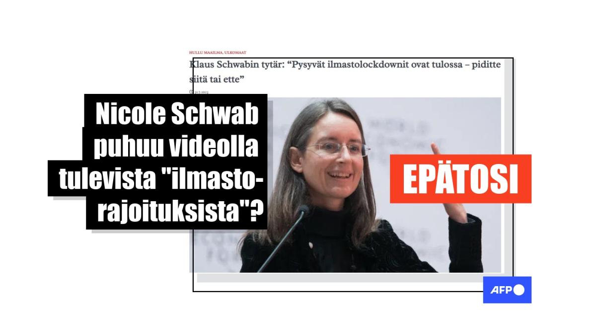 "Talousfoorumin Klasun tytär: K-tauti oli harjoitus tuleville 'ilmastorajoituksille'", sanotaan suomenkielisessä, heinäkuun lopussa julkaistussa Facebook-päivityksessä, jota on jaettu yli sata kertaa. Siinä väitetään, että Nicole Schwab on "asuntunut [sic] esiin ja julistanut", että koronapandemian aikaiset "tyrannimaiset rajoitukset" toimivat "edeltäjinä tuleville 'ilmastorajoituksille'".