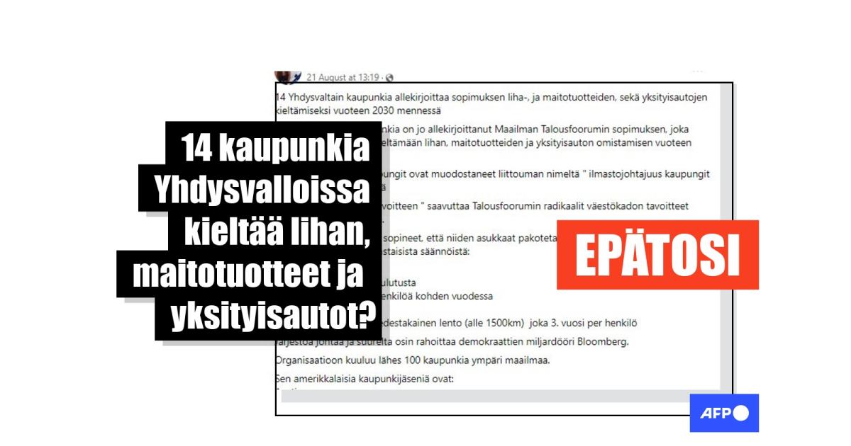 "14 amerikkalaista kaupunkia on jo allekirjoittanut Maailman Talousfoorumin sopimuksen, joka velvoittaa ne laillisesti kieltämään lihan, maitotuotteiden ja yksityisauton omistamisen vuoteen 2030 mennessä", sanotaan suomenkielisessä Facebook-päivityksessä, joka julkaistiin 21.8. ja jota on jaettu yli sata kertaa. Sen mukaan kaupunkien asukkaat "pakotetaan" noudattamaan tiettyjä "sääntöjä", joiden mukaan he eivät saa syödä liha- tai maitotuotteita tai omistaa yksityisautoja. Lisäksi he saavat ostaa vain kolme uutta vaatekappaletta vuodessa ja yhden meno-paluulennon kerran kolmessa vuodessa.