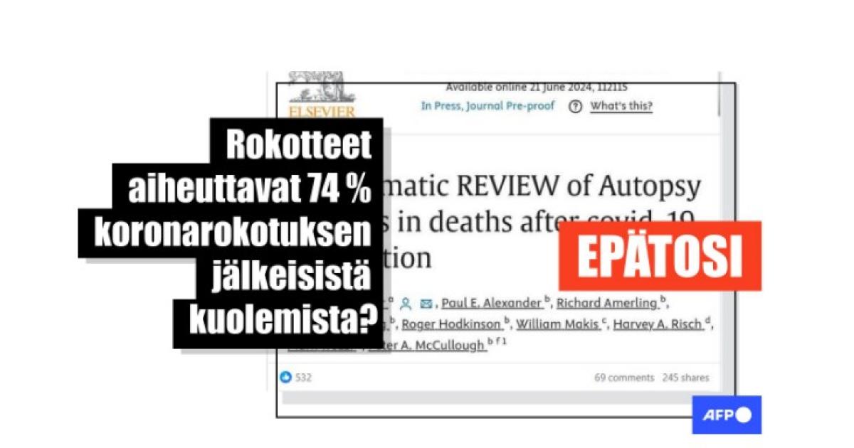 Koronarokotteet ovat pelastaneet miljoonia henkiä sen jälkeen, kun ne otettiin käyttöön pandemian aikana. Niiden turvallisuudesta jaetaan netissä silti yhä epätosia ja harhaanjohtavia väitteitä. Kesäkuun 2024 lopulla eri kielillä, myös suomeksi, sosiaalisessa mediassa levinneissä päivityksissä väitettiin uuden tutkimuksen osoittavan, että koronarokotteet aiheuttivat kuoleman tai myötävaikuttivat siihen huomattavasti 74 %:ssa rokotuksen jälkeen tapahtuneista kuolemantapauksista. Lisäksi väitettiin, että arvostettu tiedelehti The Lancet olisi sensuroinut tutkimuksen. Asiantuntijat kertoivat kuitenkin AFP:lle, että tutkimuksen menetelmissä on useita puutteita ja että muut tutkimukset eivät tue siinä esitettyjä johtopäätöksiä. Tutkimuksen preprint-versio ladattiin The Lancet Groupin ylläpitämälle preprint-sivustolle, mutta sitä ei koskaan julkaistu lehdessä itsessään.
