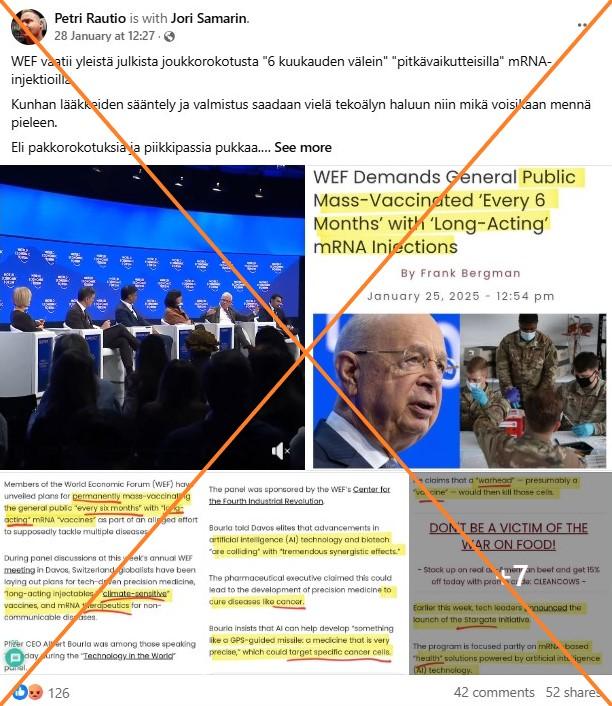"WEF vaatii yleistä julkista joukkorokotusta '6 kuukauden välein' 'pitkävaikutteisilla' mRNA-injektioilla", väitetään suomenkielisessä, 28.1.2025 julkaistussa Facebook-päivityksessä.