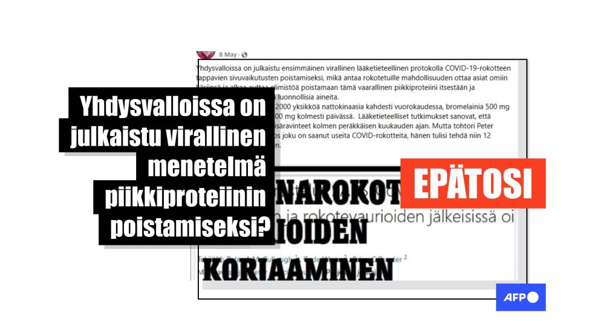 "Yhdysvalloissa on julkaistu ensimmäinen virallinen lääketieteellinen protokolla COVID-19-rokotteen tappavien sivuvaikutusten poistamiseksi, mikä antaa rokotetuille mahdollisuuden ottaa asiat omiin käsiinsä ja alkaa auttaa elimistöä poistamaan tämä vaarallinen piikkiproteiini itsestään ja kudoksistaan käyttämällä luonnollisia aineita", väitetään suomenkielisessä, 8.5.2025 julkaistussa Facebook-päivityksessä. Samanlaisia väitteitä jaettiin yhteensä yli sata kertaa Facebookissa.