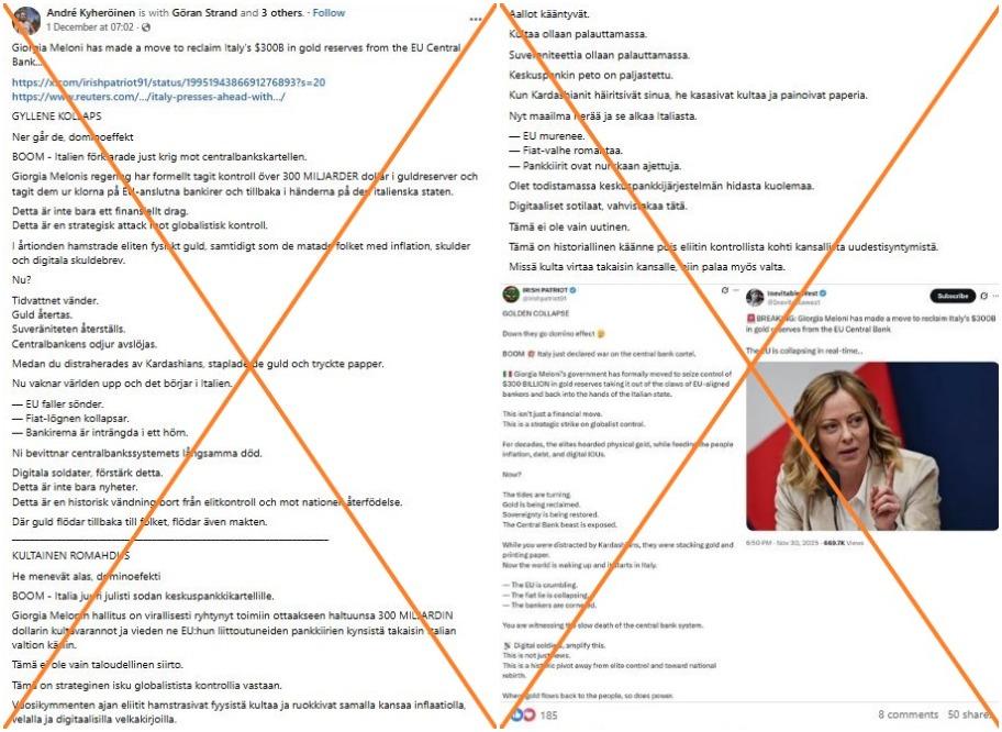"Giorgia Melonin hallitus on virallisesti ryhtynyt toimiin ottaakseen haltuunsa 300 MILJARDIN dollarin kultavarannot ja vieden ne EU:hun liittoutuneiden pankkiirien kynsistä takaisin Italian valtion käsiin", sanotaan 1.12.2025 suomeksi ja ruotsiksi julkaistussa Facebook-päivityksessä, jota on julkaisun jälkeen jaettu kymmeniä kertoja.