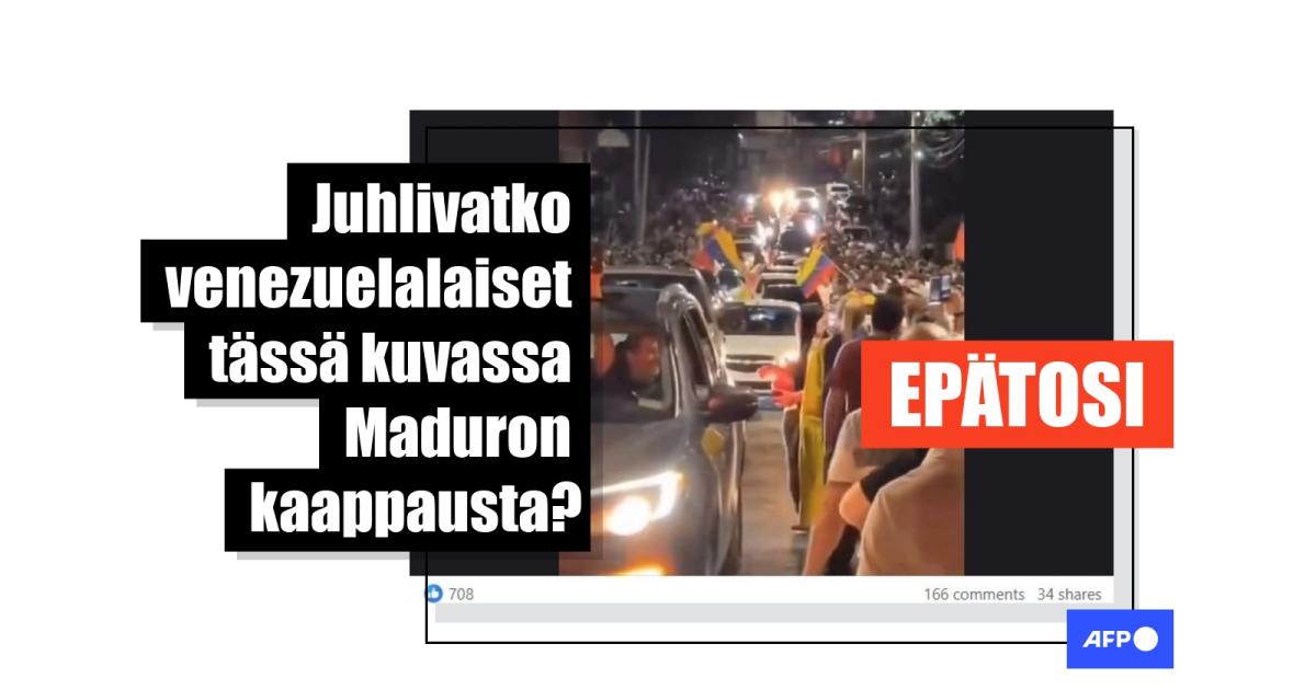 Yhdysvallat kaappasi Venezuelan presidentti Nicolás Maduron ja tämän vaimon Cilia Floresin sotilasoperaatiossa aamuyöllä 3.1.2026. Operaation jälkeen sekä suomen- että muunkielisessä sosiaalisessa mediassa on levinnyt kuvia, joissa venezuelalaisten väitetään juhlivan tapahtunutta. Kuvat eivät kuitenkaan liity vuoden alun tapahtumiin ja ne on otettu Venezuelan sijaan Panamassa. Niitä jaettiin aiemmin Maduron vastaisten mielenosoitusten yhteydessä Panama Cityssä heinäkuussa 2024.