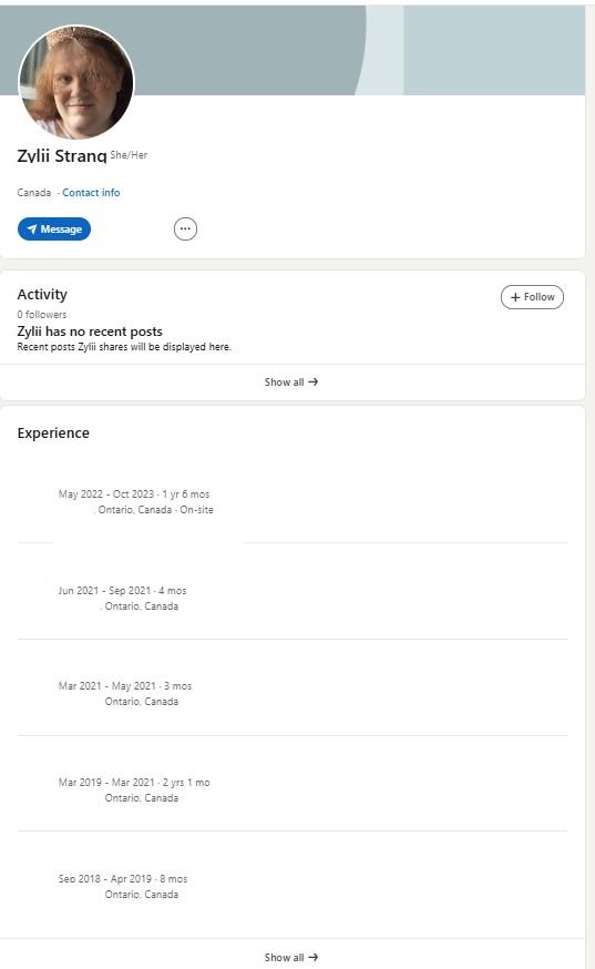 Zylii Strangin sittemmin poistetulla LinkedIn-sivulla listattiin työkokemusta Ontariossa vuosien 2017–2023 välillä.