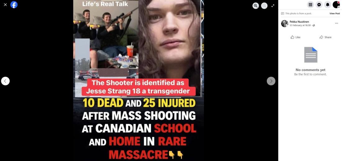 Pian ampumisen jälkeen suomeksi kirjoitetussa X-päivityksessä väitetään, että ampuja oli "transnainen Jesse Strang" ja että hän on päivitykseen liitetyissä kuvissa. Päivitystä on jaettu yli 200 kertaa sen jälkeen, kun se julkaistiin 11.2.2026, ja se on herättänyt paljon transfobisia kommentteja.