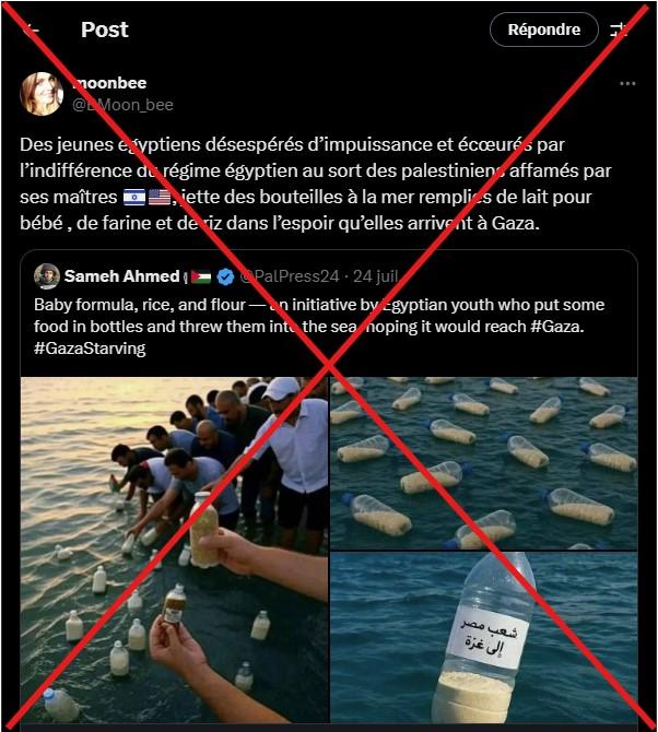 "Des jeunes égyptiens désespérés d'impuissance et écœurés par l'indifférence du régime égyptien au sort des palestiniens affamés par ses maîtres israéliens et états-uniens jette des bouteilles à la mer remplies de lait pour bébé, de farine et de riz dans l'espoir qu'elles arrivent à Gaza", écrit une internaute sur X.